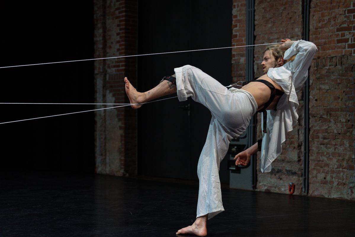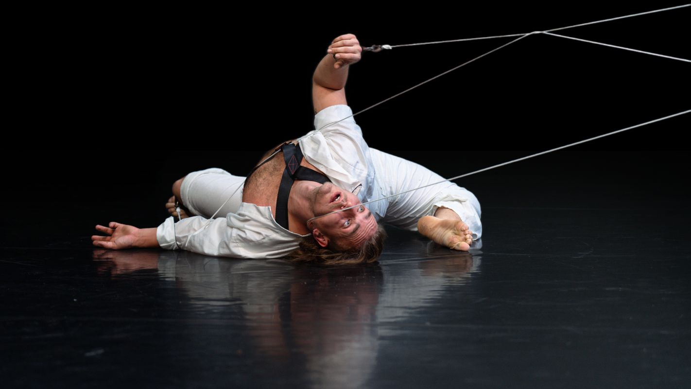 The performance explores what attachment means: the fear of control, leaning into/onto each other ánd trust, in a struggle of intimacy.