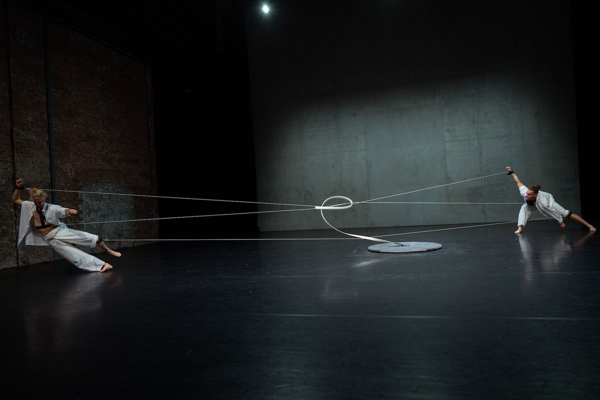 Connected through a mechanical structure, two performers find each other, sensing the other's body and movement in a state of distanced intimacy. The performers continuously attempt to find a balance between themselves, surrendering to themselves and the other, leaning on and trusting in each other. They save, move and hold one another, but at what cost for themselves?